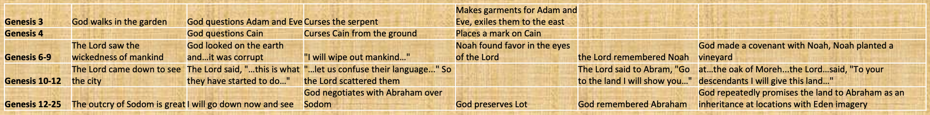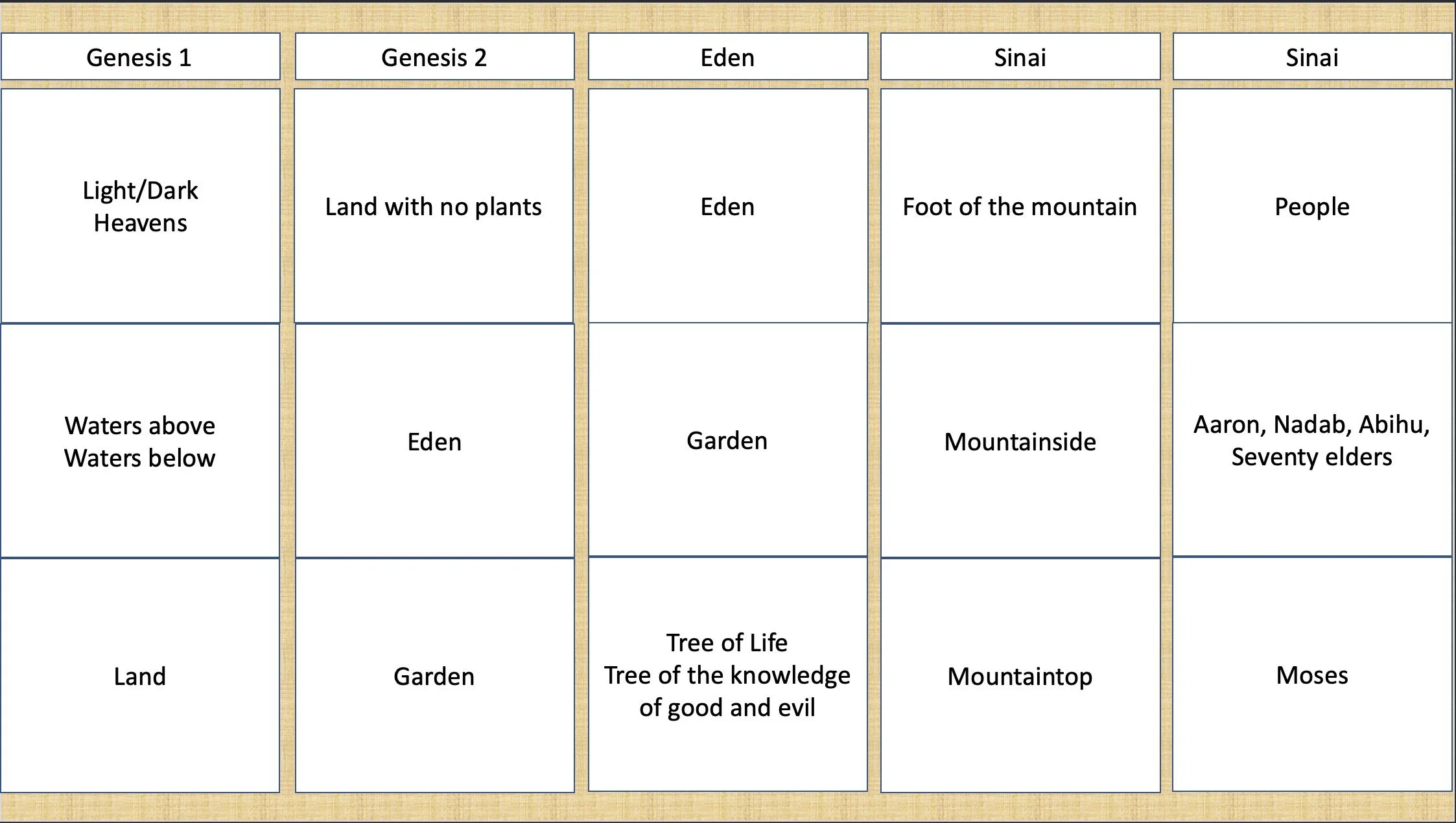 In Genesis 2, God forms man in the wilderness and places him in the garden, where he instructs the man and, in the wind of the day, is present together with him and the woman. In Exodus, after the waters divide to yield dry land, out of a mixed multitude, God forms a nation and brings them to Sinai, where he appears in weather phenomena and gives them instruction.