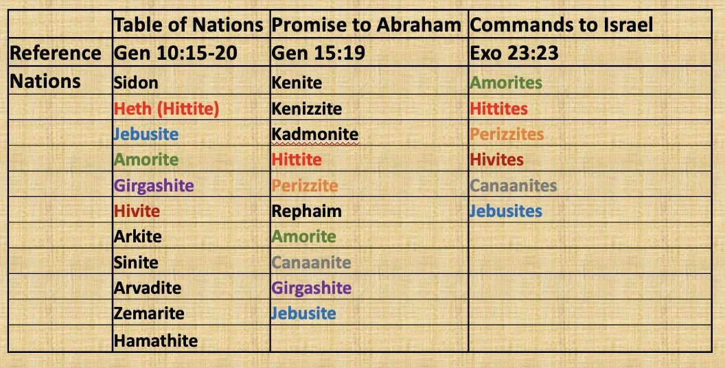 God tells Moses to go up with the people of Israel, recalls his promise to Abraham, Isaac, and Jacob, declares he will send an angel before them, and describes the land of Canaan in people group language that echoes Genesis 15 and Exodus 3, 13, and 23. The named peoples vary in these passages, though the territory is the same.